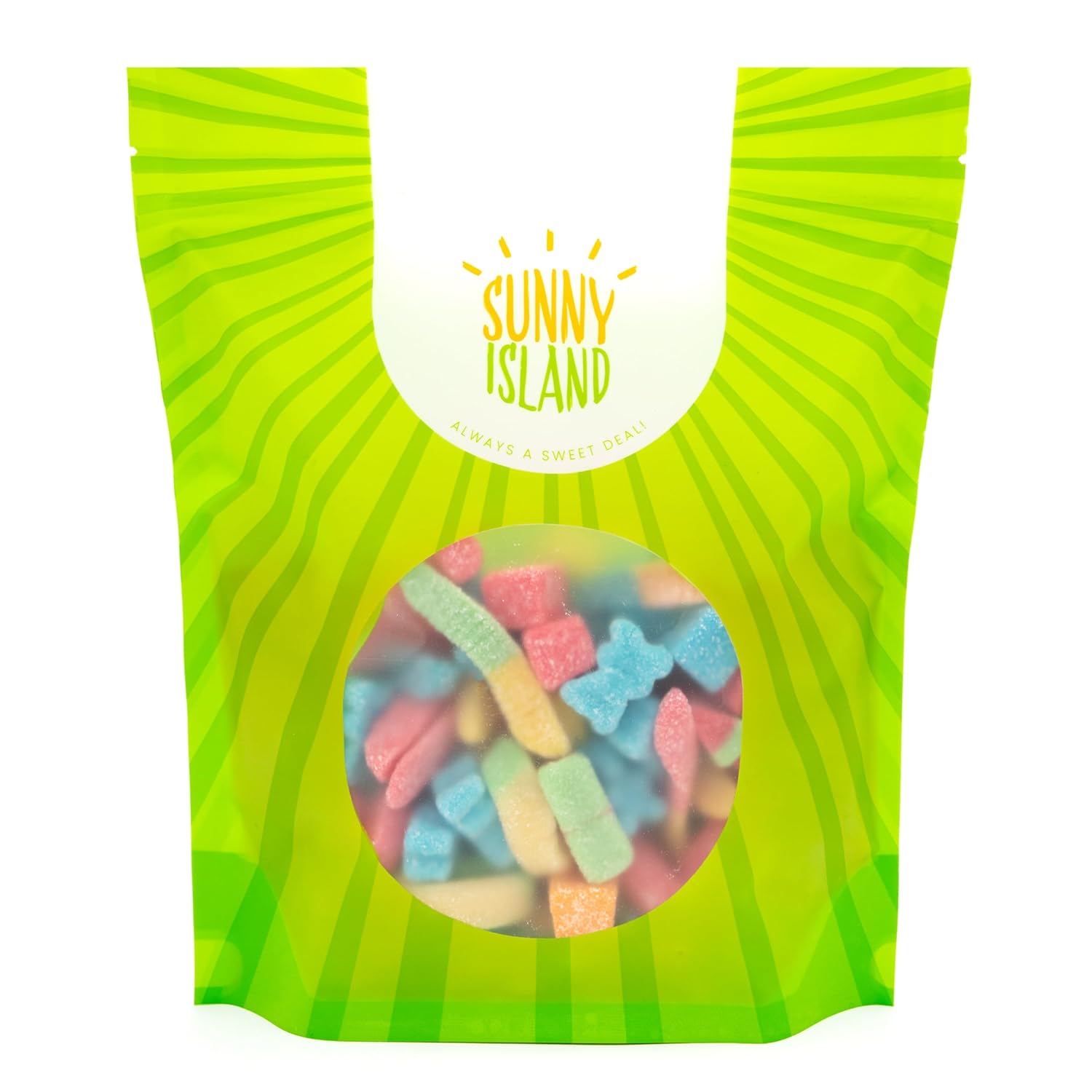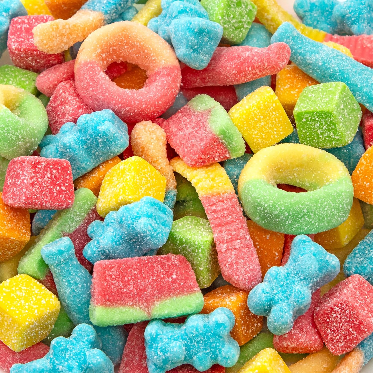 • Rings, Sour Gummy Blocks, Sour Gummy Bottles, and Watermelon Wedges - a vibrant, chewy lineup of shapes and textures