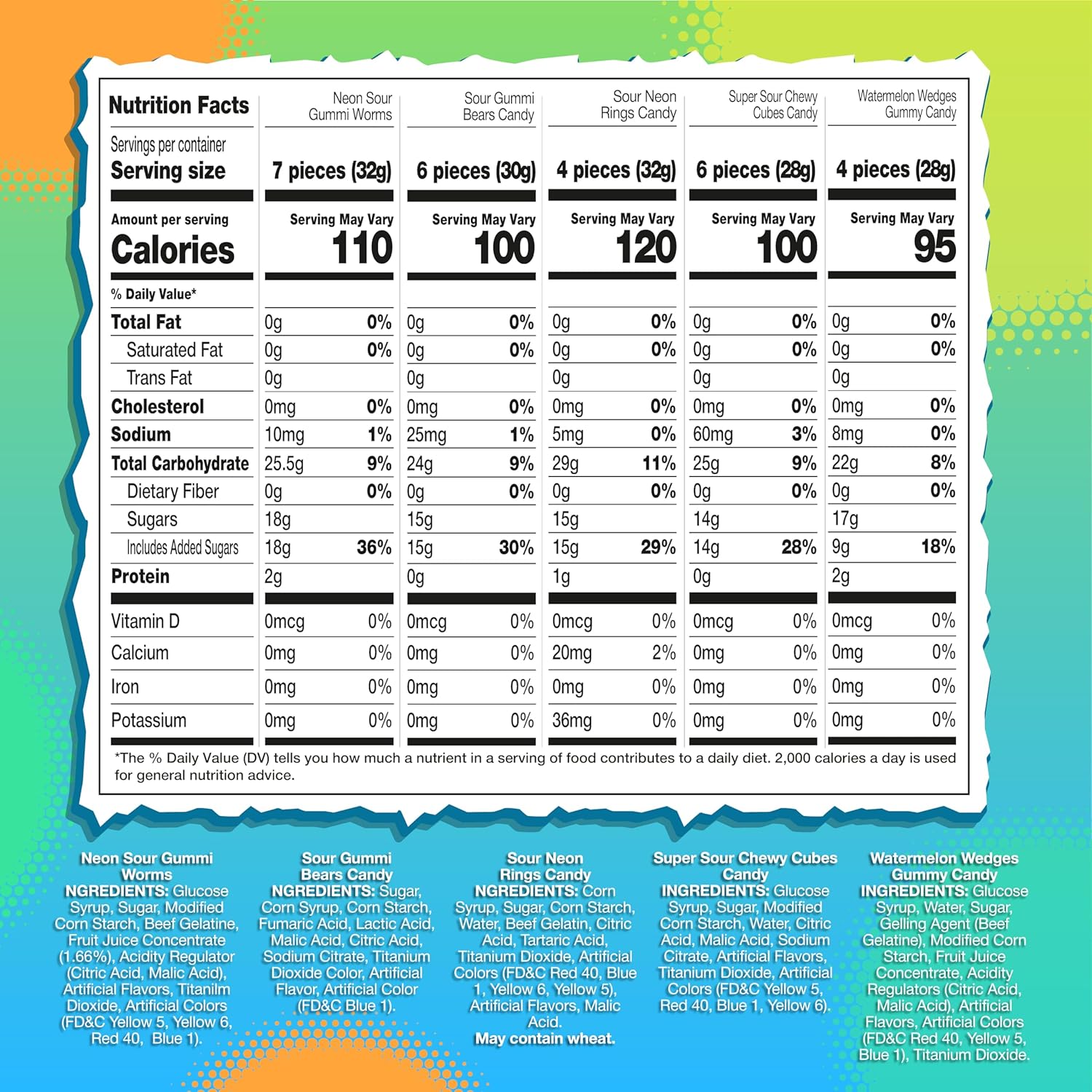 Includes sour Blue Raspberry Gummi Bears, Sour Gummy Worms, Sour Neon Gummy