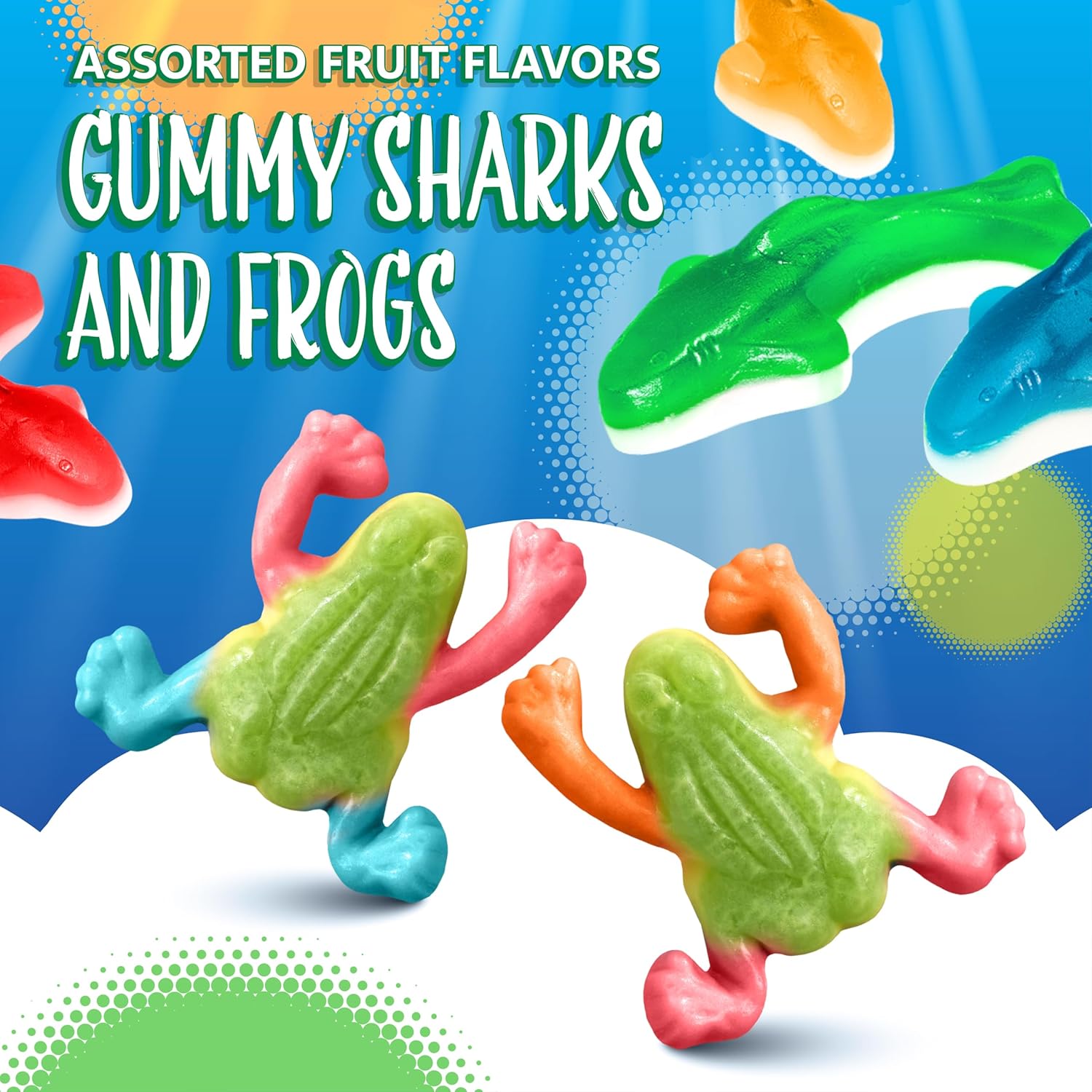• Dive into a world of sweet fun with this vibrant mix of gummy sharks and tropical frogs, bursting with bold fruit flavors and wild personality that will make every candy bowl a true adventure