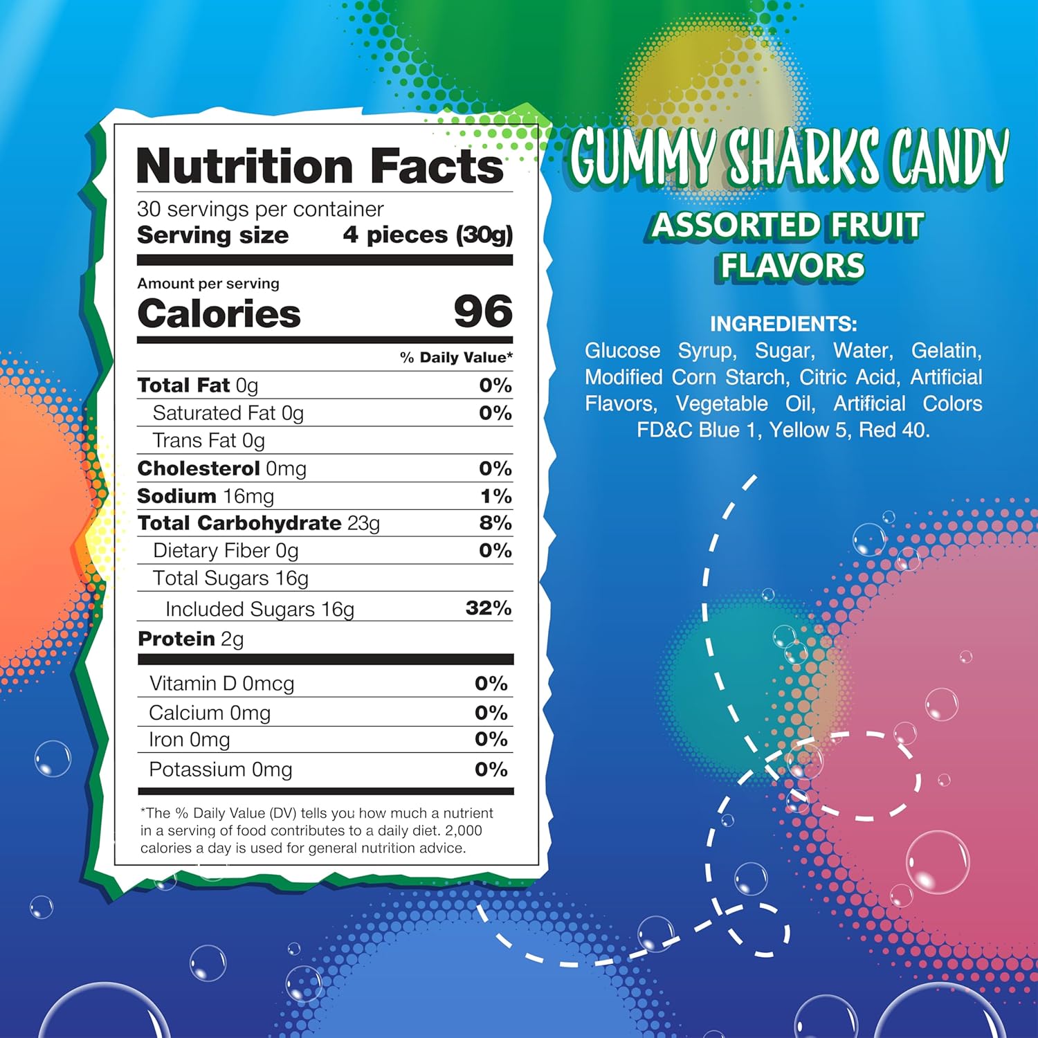 • This bulk bag holds 2 pounds of Colorful Gummy Sharks Candy in Assorted Fruit Flavors; approximately 120 pieces per order