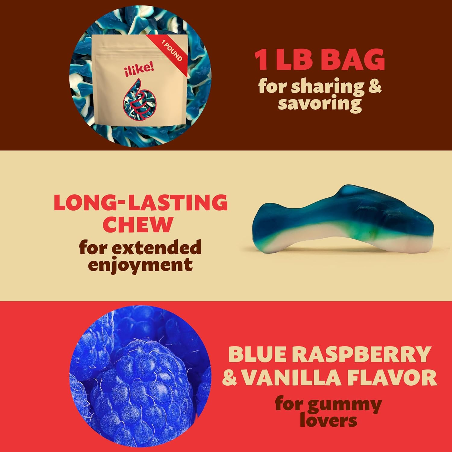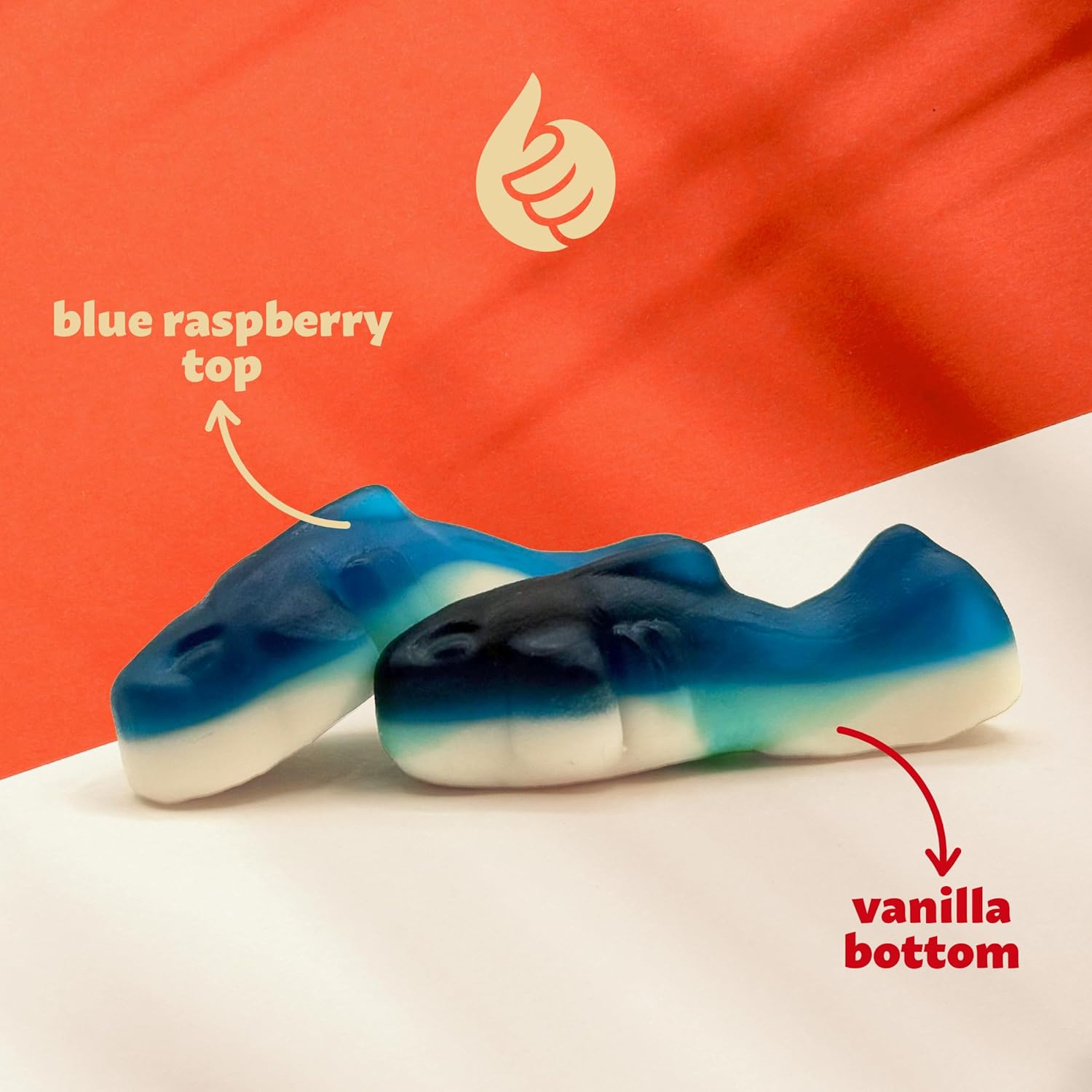 • Add a splash of summer to your candy selection with blue gummy sharks - a playful mix of fruity blue raspberry and sweet vanilla flavors in every chewy piece