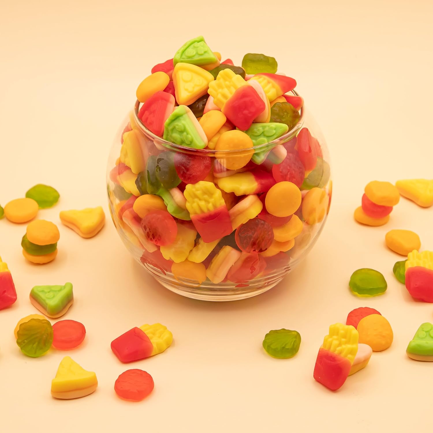• Bring fun to snack time with this whimsical mix of gummy food, featuring colorful gummy hamburger candy, chewy pizza slices, and fruity French fries gummies