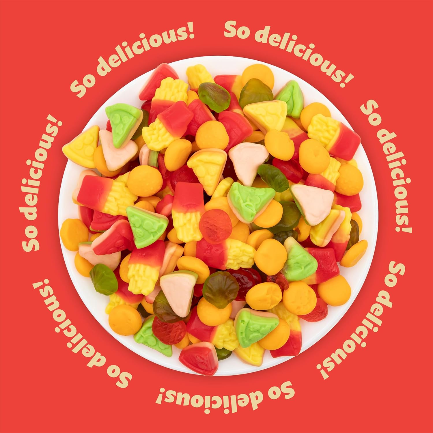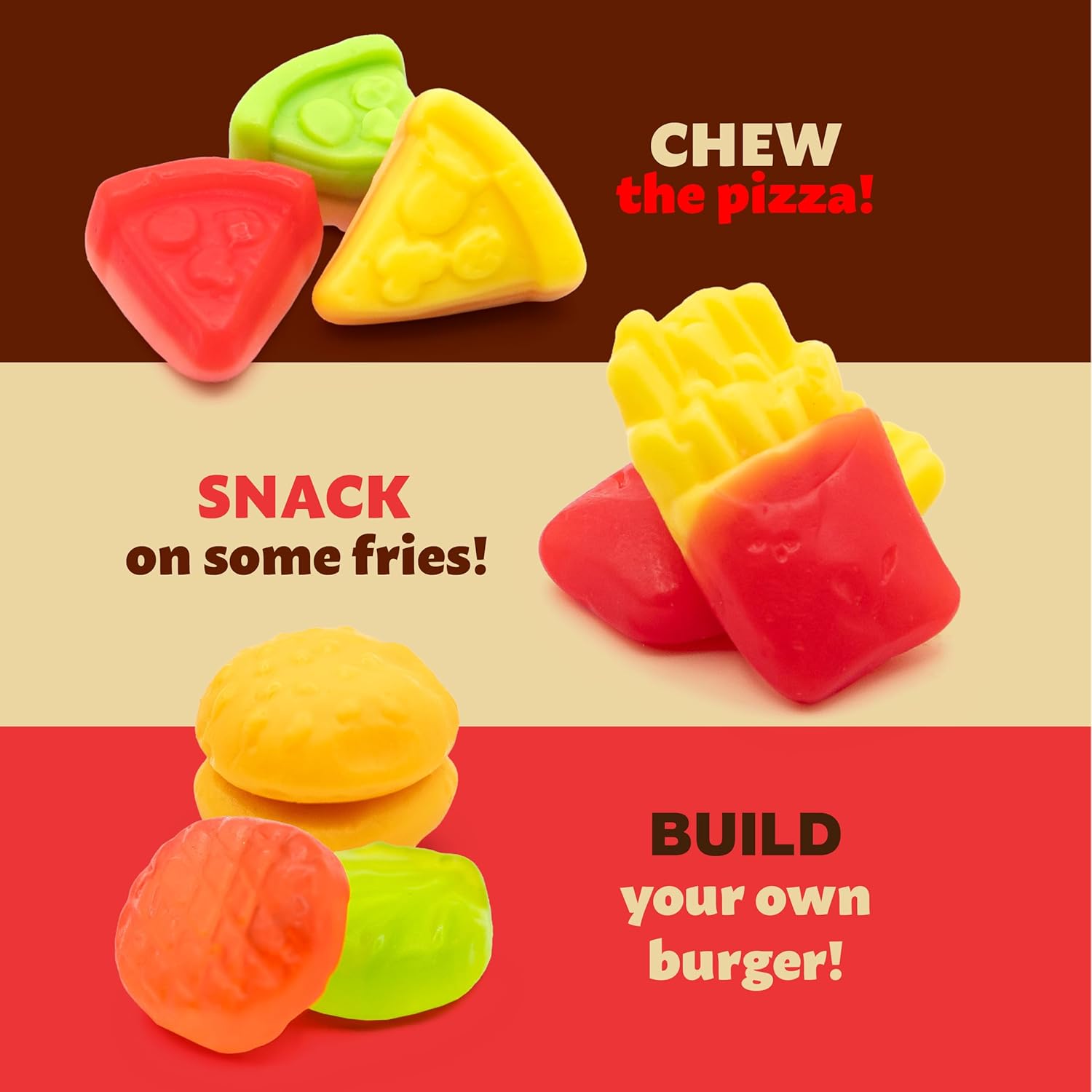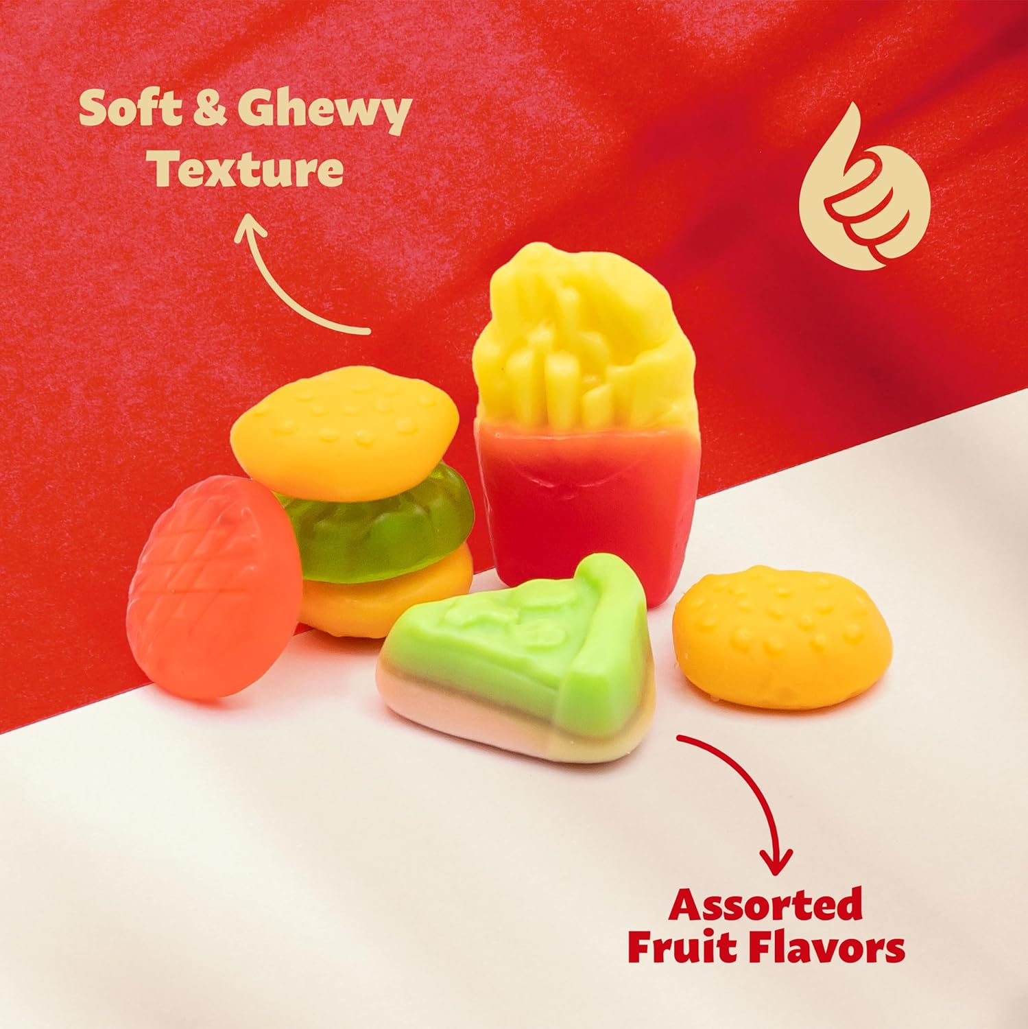 • Packed with variety and flavor, this bulk bag of gummy food candy turns everyday meals into sweet adventures - complete with gummy pizza and chewy fries