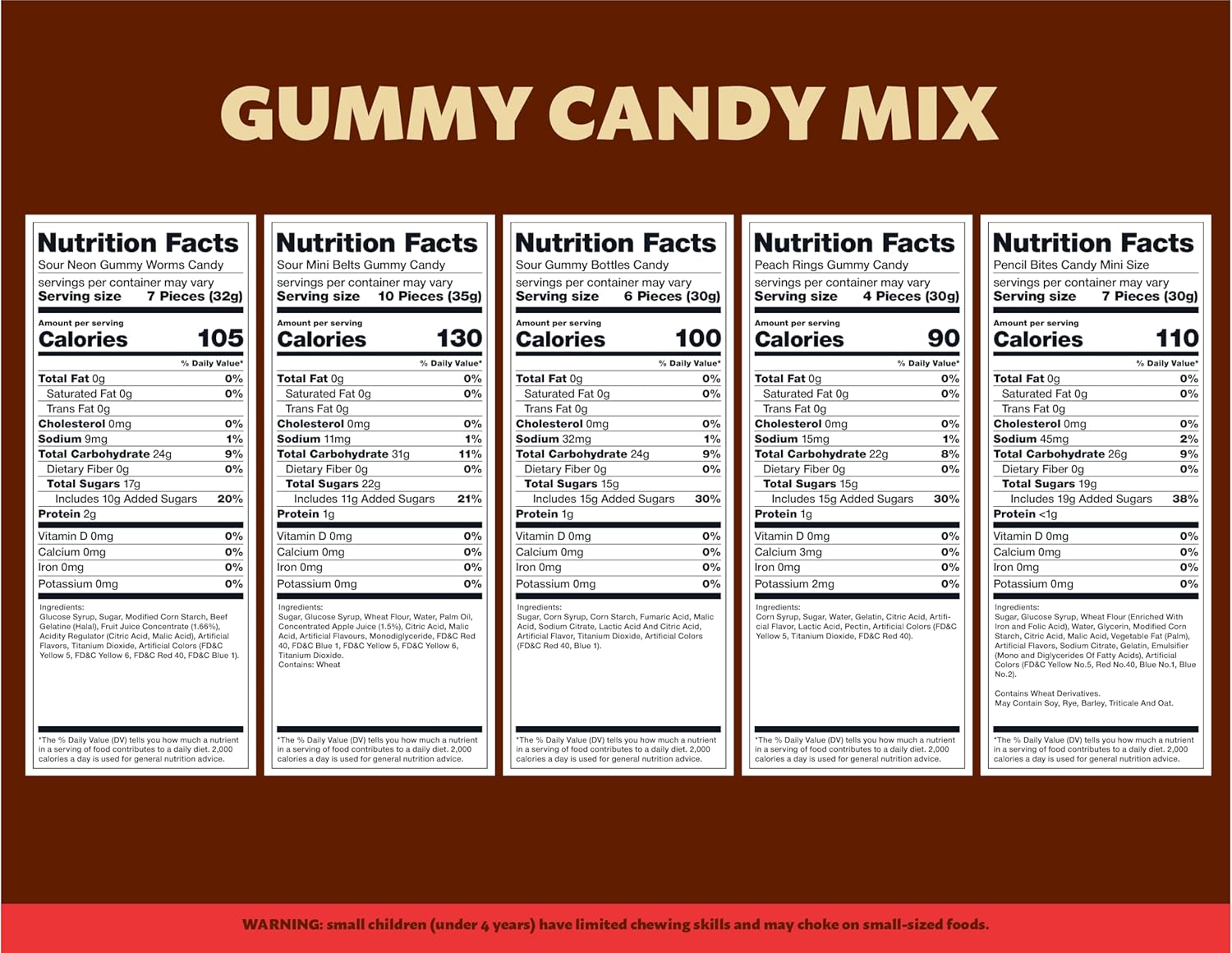 • Enjoy a mix of whimsical shapes, including Peach Rings, Worms, Bottles, Belts, and Pencil Bites, each offering a burst of fruity flavor