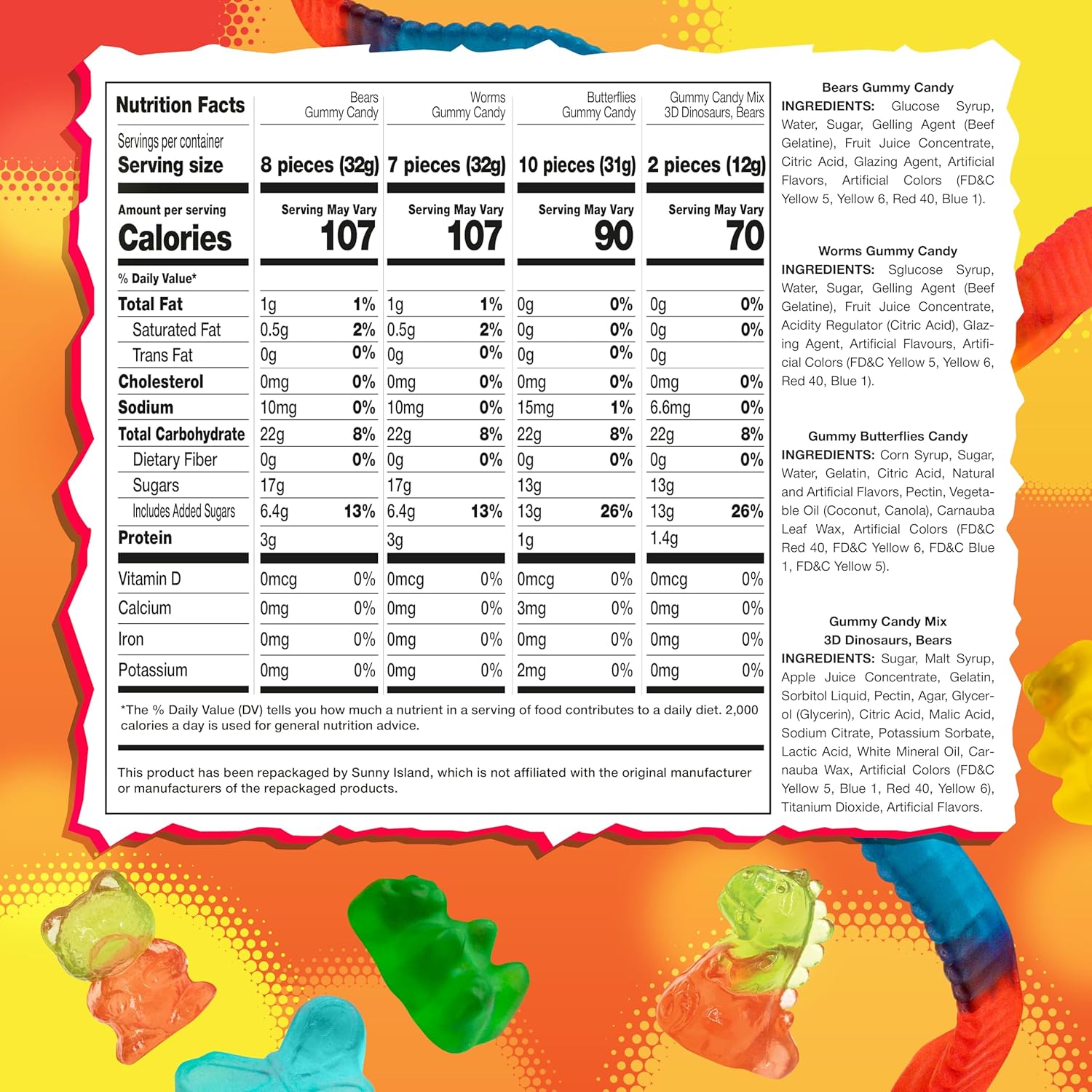 This 2-pound Gummy Candy Mix is a playful gummy variety pack filled with chewy, fruity fun, perfect for candy buffets, goody bags, party favors, baking, and snacking adventuresIncludes classic Gummi Bears, wriggly Gummy Worms, delicate Gummy Butterflies, and eye-catching 3D Gummy Dinosaurs and 3D Gummi Bears - a vibrant, chewy lineup of shapes and texturesBursting with assorted fruit flavors, this gummy mix delivers a rainbow of juicy taste in every bite - ideal for kids’ parties, classroom rewards, or movie night candy spreadsUse this bulk gummy candy to top cakes, cupcakes, or ice cream sundaes with bold color and whimsical charm, or pack into jars for creative gifts and event displaysWhether you're building a DIY snack bar, prepping office candy bowls, or need a dependable stash of candy gummies, this assorted gummy candy mix brings fun and flavor to every occasion