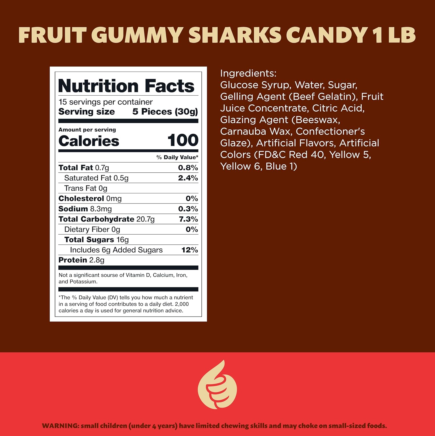 • This bag holds 1 pound of Assorted Fruit Gummy Sharks Candy - soft, chewy, and bursting with flavors like Cherry, Lime, Lemon, and Blue Raspberry for a splash of ocean-inspired fun