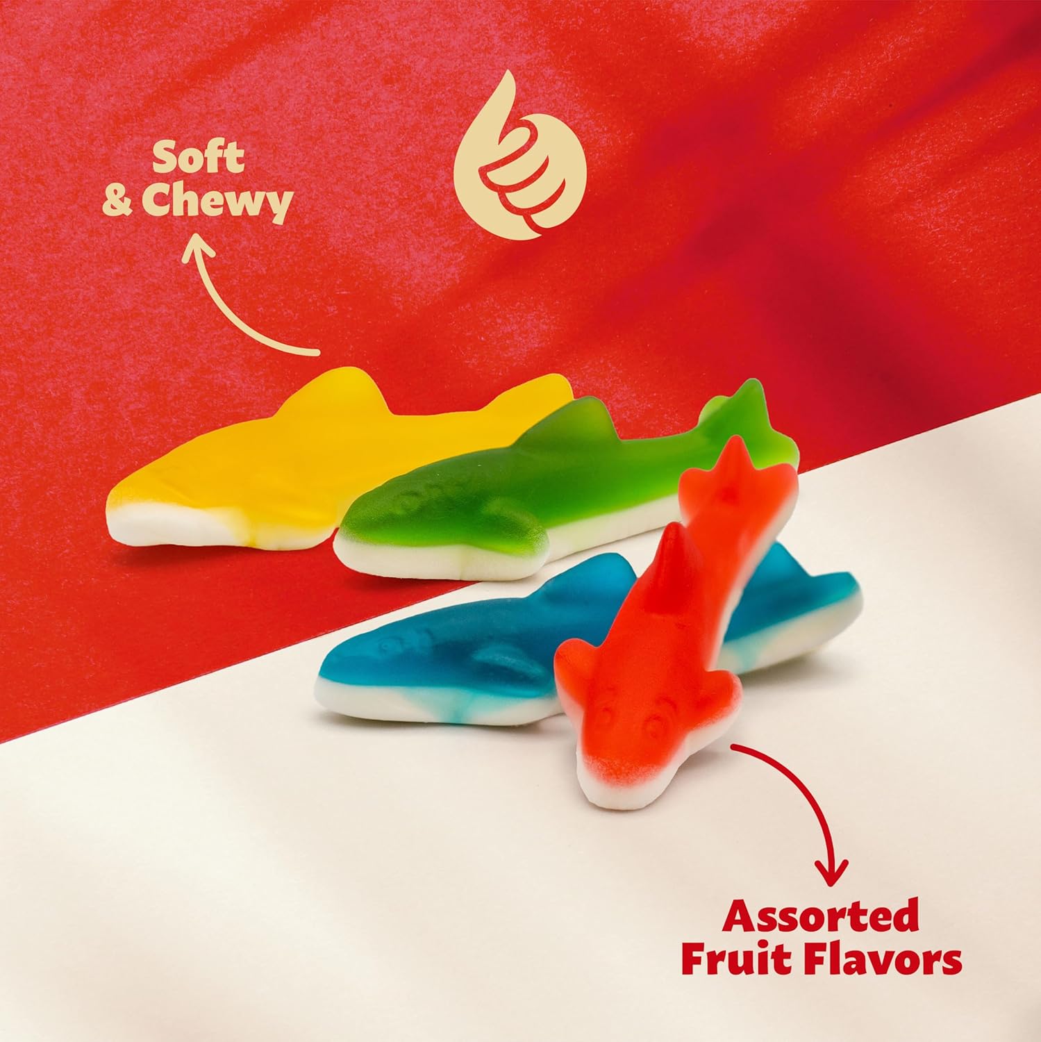• Add a wave of flavor to your candy selection with these colorful gummy sharks and more - each chewy piece offers a playful mix of sweet, tangy fruit taste and soft texture